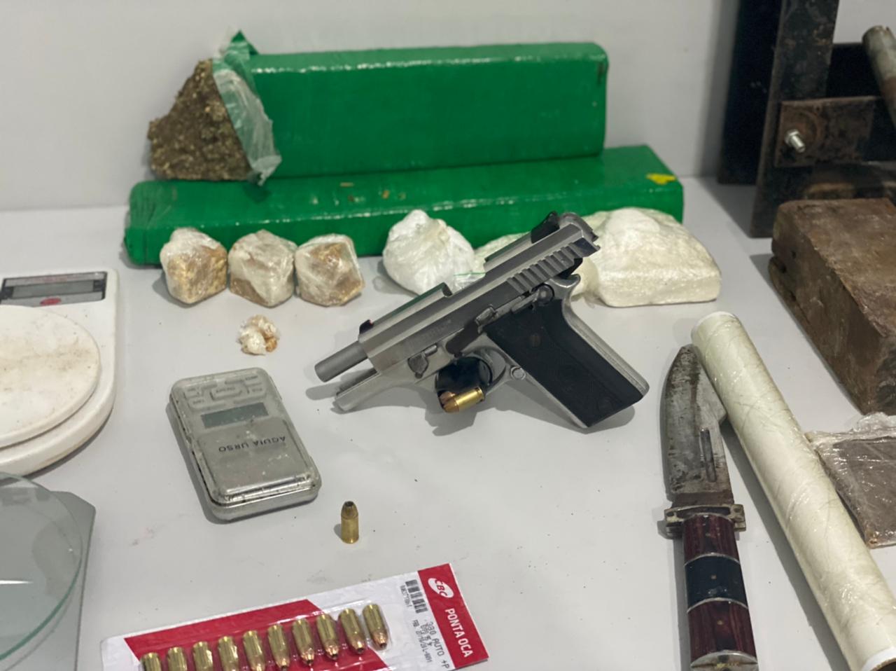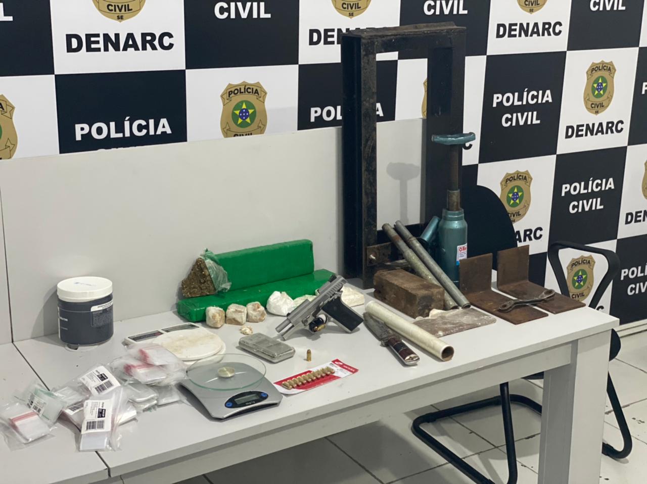 Os policiais civis apreenderam tabletes de substância similar à maconha e porções de substâncias análogas à cocaína e crack. Ainda foram apreendidos uma prensa - usada para produzir drogas para a compra e venda -, a pistola 380, duas balanças e diversos outros insumos para o tráfico de drogas.