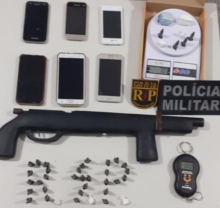 Uma varredura foi realizada no local e os militares encontraram uma espingarda calibre .12, duas balanças de precisão, aproximadamente, 60 gramas de cocaína, divididos em pinos e trouxas, e seis celulares.