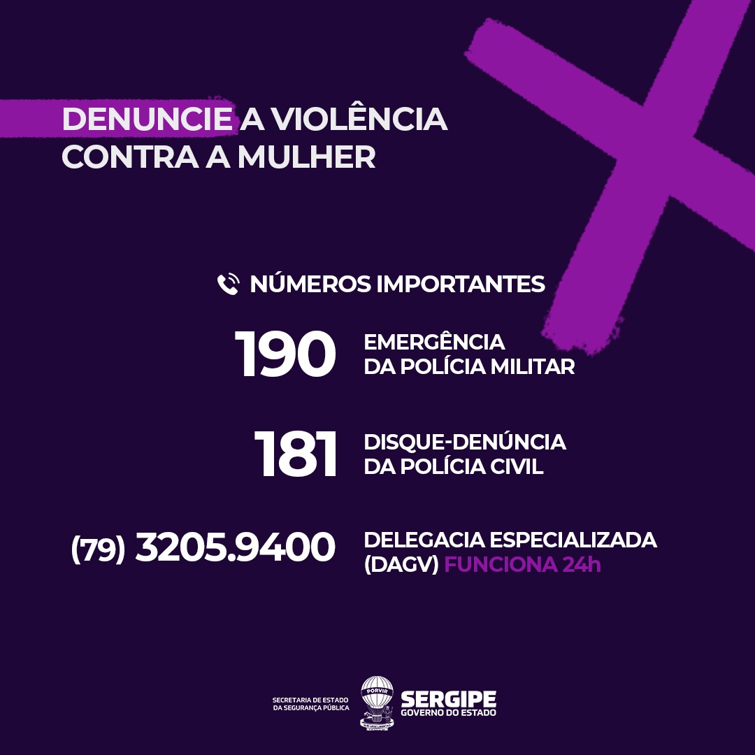 A Secretaria da Segurança Pública (SSP) orienta que, nos casos de violência contra a mulher, a Polícia Militar pode ser acionada por meio do Centro Integrado de Operações em Segurança Pública (Ciosp - 190), nas situações em que o crime esteja ocorrendo. As denúncias também podem ser feitas por qualquer pessoa por meio do Disque-Denúncia da Polícia Civil, no telefone 181. O sigilo é garantido. O telefone do DAGV, unidade plantonista que funciona 24h, é o (79) 3205-9400.