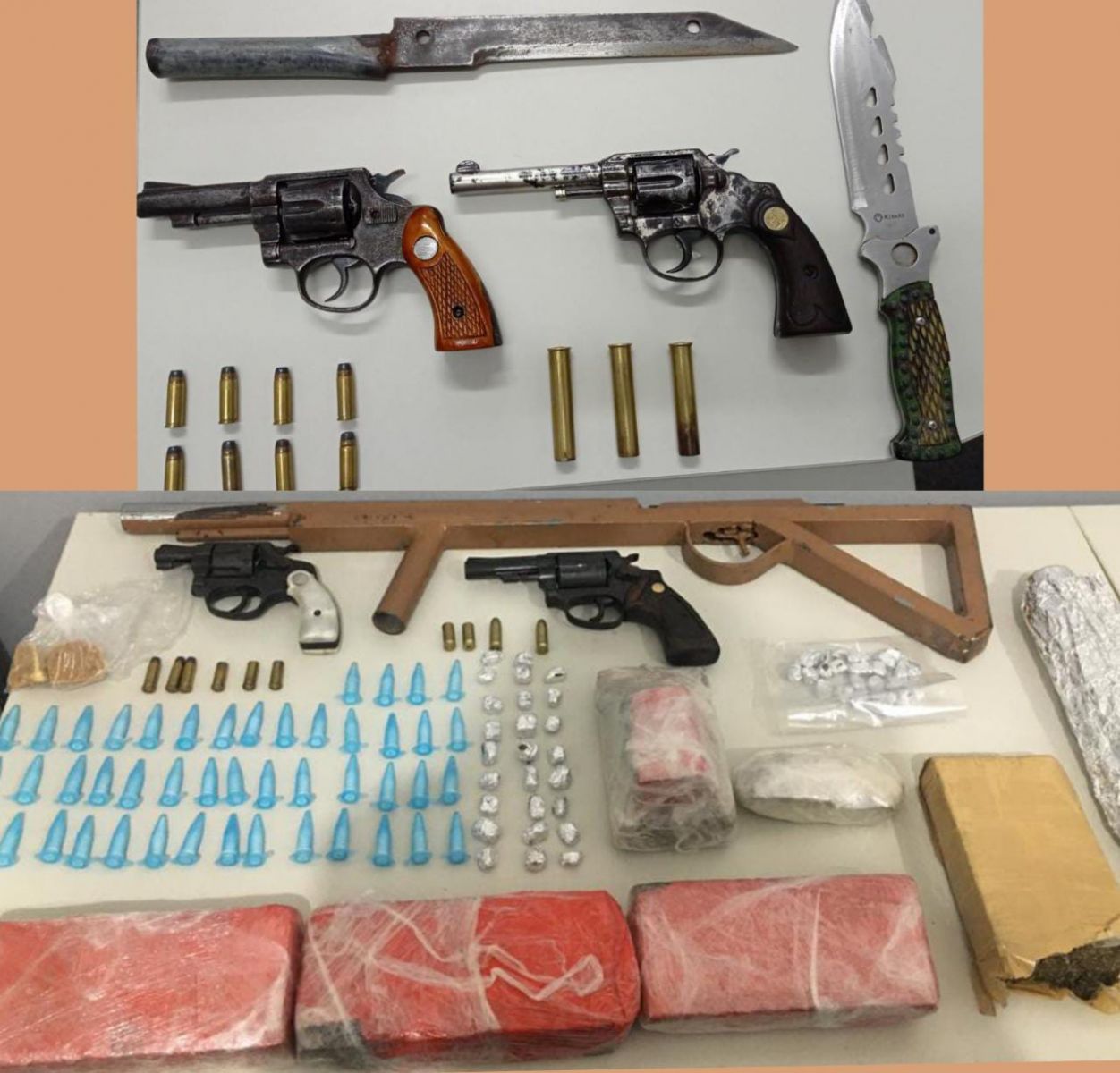 Na operação, deflagrada após três meses de investigações, as equipes policiais apreenderam ainda cinco armas de fogo, especificamente uma espingarda caseira de calibre 12 e quatro revólveres, munições intactas e cartuchos. Foram encontrados também mais de três quilos em tabletes de entorpecentes semelhantes à maconha, 75 buchas da mesmas substância, 46 eppendorfs com um produto semelhante à cocaína e duas pedras de substância análoga à maconha. Além disso, na casa de um dos suspeitos, foi encontrada uma motocicleta roubada.