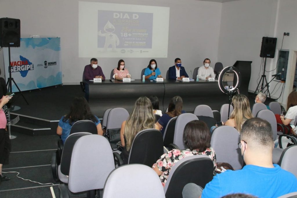A Secretária de Estado da Saúde, Mércia Feitosa, reuniu a imprensa às 11 da manhã desta quinta-feira, 23, para anunciar o Dia “D” de vacinação contra a Covid-19, que acontecerá neste sábado, 25, em todos os 75 municípios sergipanos. A coletiva aconteceu no auditório do Centro Administrativo da Saúde Senador Gilvan Rocha e contou com a participação de veículos de imprensa, da diretoria do Conselho de Secretários Municipais de Saúde, (Cosems), Enock Ribeiro, do superintendente do Ministério da Saúde em Sergipe, Thiago Rangel, e secretários municipais de Saúde.