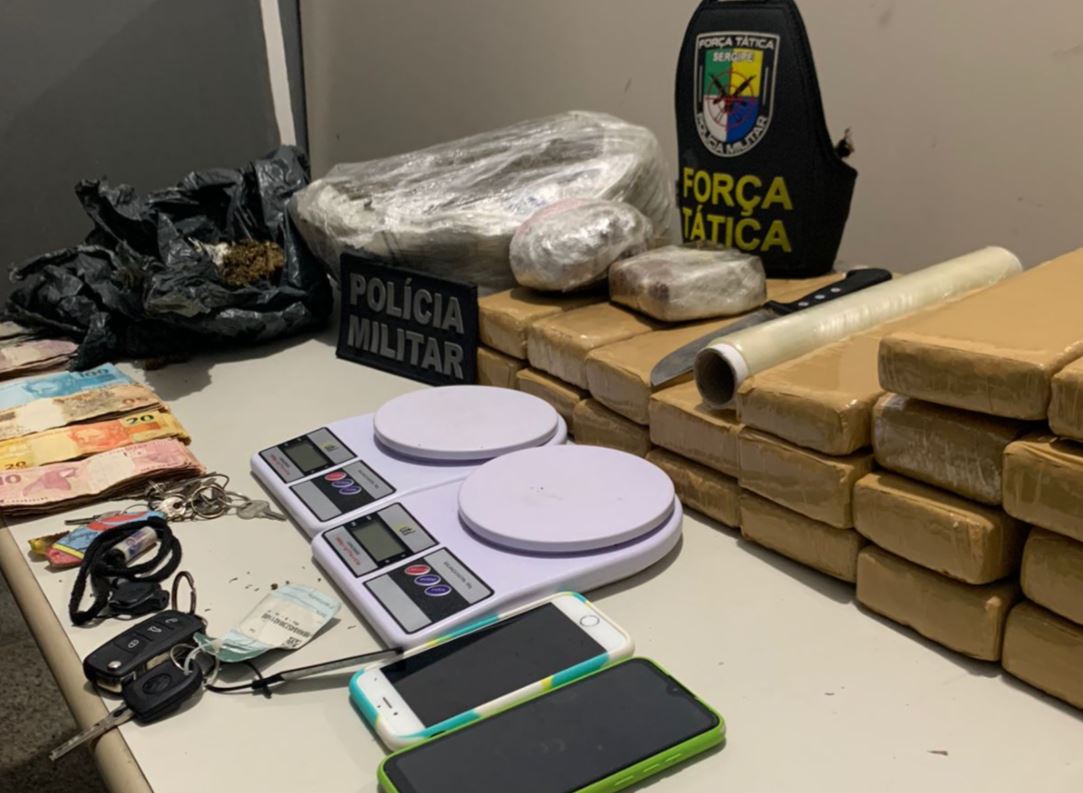 Já no local, no quarto, foi encontrada uma mala contendo diversos tabletes de substância semelhante à maconha, além de duas balanças de precisão, faca e plástico filme.