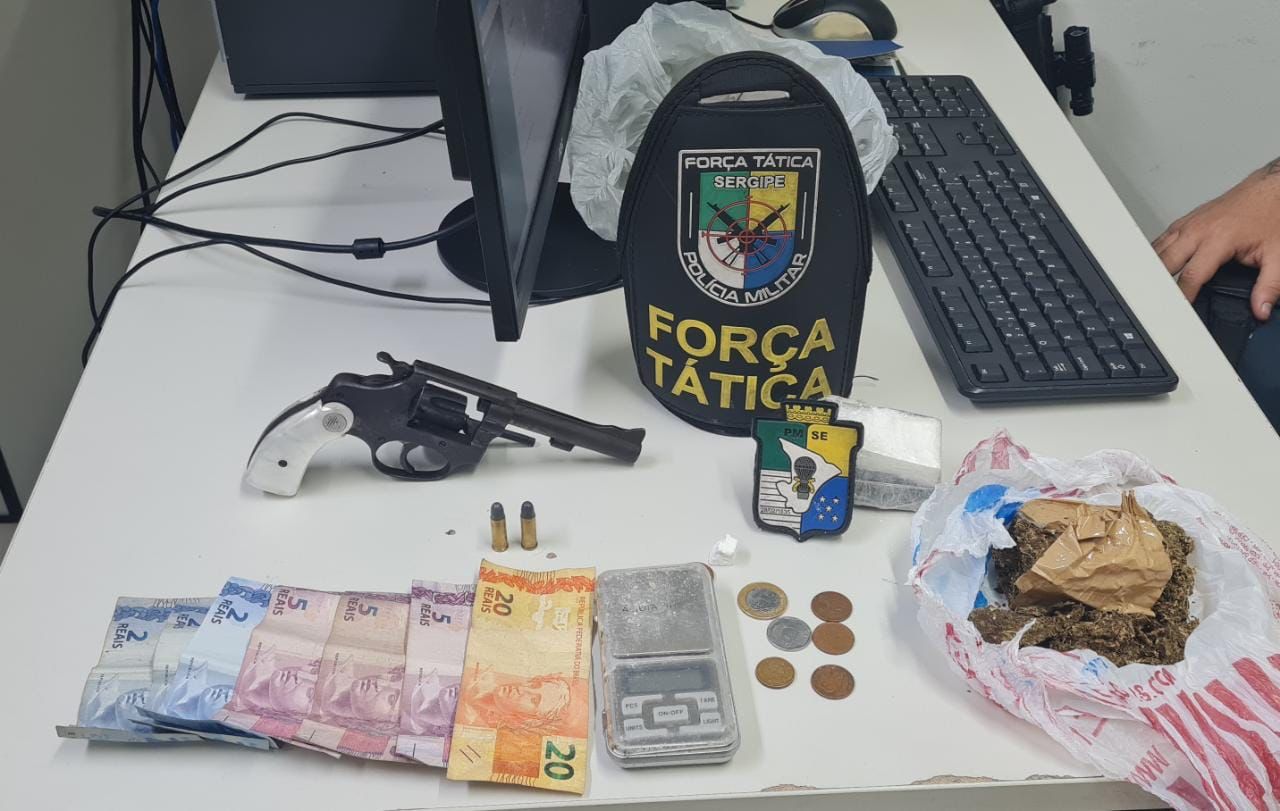 A testemunha afirmou que o homem é casado com sua irmã e a agrediu apontando uma arma de fogo para a cabeça da esposa. Na residência do casal, foi encontrada cocaína, maconha, balança de precisão, arma de fogo calibre 32, duas munições e uma quantia em dinheiro.