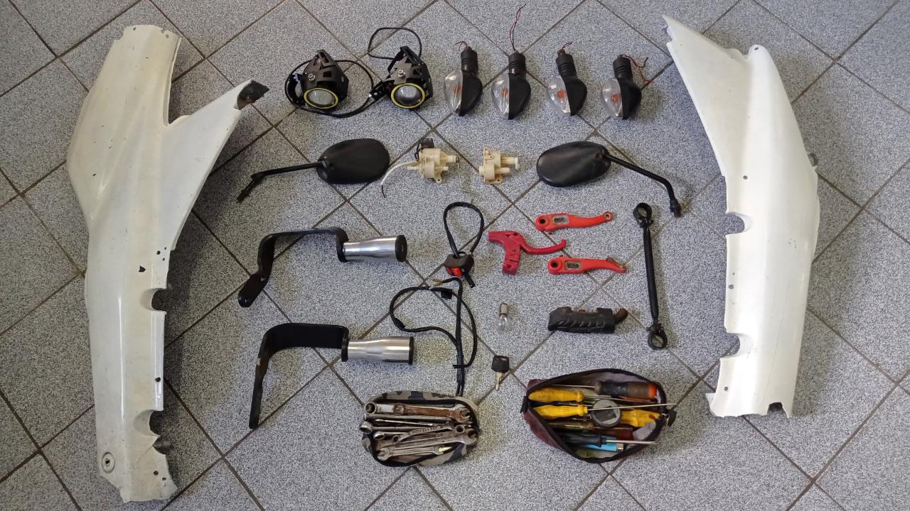 Durante o cumprimento do mandado de busca e apreensão e de prisão preventiva, dentre outros objetos, foram apreendidos: dois revólveres calibre 32, várias munições, insumos para fabricação de munição, várias peças de motocicletas e uma caixa de ferramentas que provavelmente era utilizada para desmontar os veículos roubados.